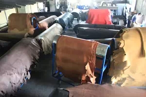 皮革進(jìn)行浸染,也就是皮革表面和內(nèi)里都會(huì)染色。染色步驟完成后,藍(lán)濕皮變?yōu)槠づ摺?/span>