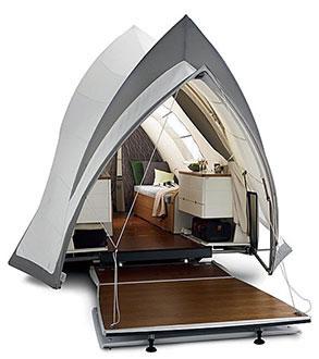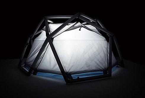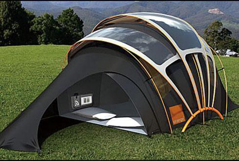 近年來,帳篷設(shè)計潮流越發(fā)趨向綠色環(huán)保。這款帳篷設(shè)計前衛(wèi),裝有WiFi鏈接裝置、太陽能電池板和照明系統(tǒng)。